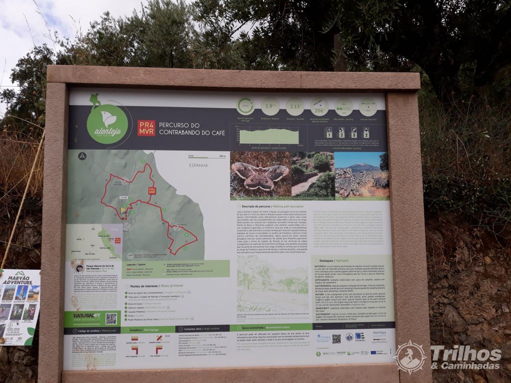 Logo à partida e apesar do relevo irregular da paisagem, torna-se evidente de que este é o reino do sobreiro. Bosques quase ininterruptos desta árvore, apenas interrompidos pelos afloramentos graníticos e pelos vales ainda agricultados, vão-nos acompanhando por quase todo o percurso. Ao longo deste passeio um conjunto de 3 pequenos povoados fronteiriços, Galegos, Monte de Baixo e Pitaranha, sugerem uma estreita cumplicidade com a sua congénere espanhola, La Fontañera, zona por onde os contrabandistas recetavam o café. Estreitas e sinuosas veredas, por vezes em calçada medieval, ladeadas de muros e escondidas na sombra de frondosos sobreiros foram outrora caminhos de contrabandistas. Agora, guiam-nos pelas mesmas paisagens mas por outras aventuras. Na subida para Pitaranha ganhamos vistas para o morro do Castelo de Marvão. Já nas cercanias da aldeia conseguimos ver parte da Serra de Porto de Roque, uma penedia escarpada que faz parte de uma estreita mas longa cordilheira rochosa que se estende ao longo da fronteira e que serve de abrigo a colónias de grifos, uma grande ave planadora que frequentemente patrulha estes céus transfronteiriços.